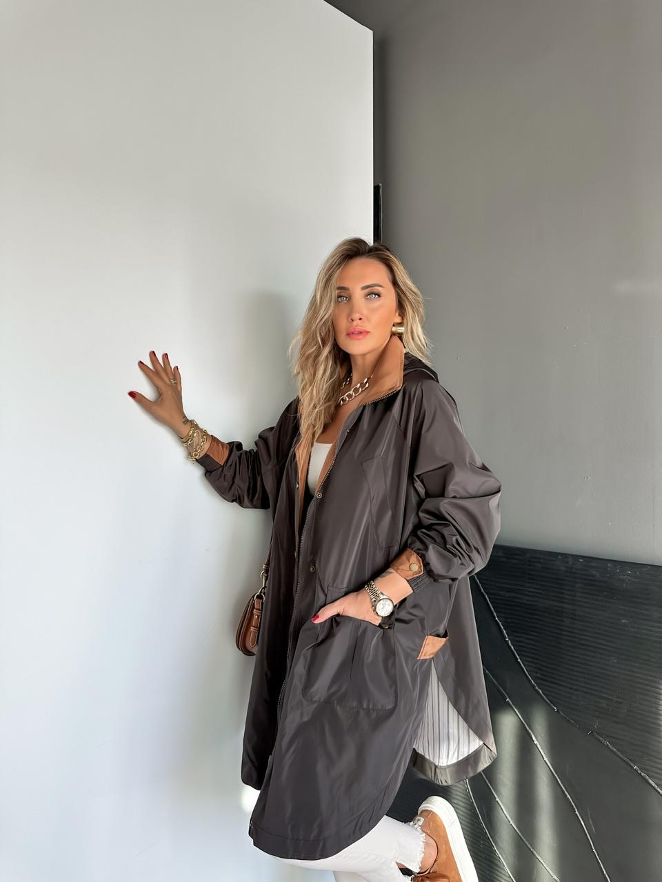 Acı Kahve Kapşonlu Tasarım Premium Trençkot