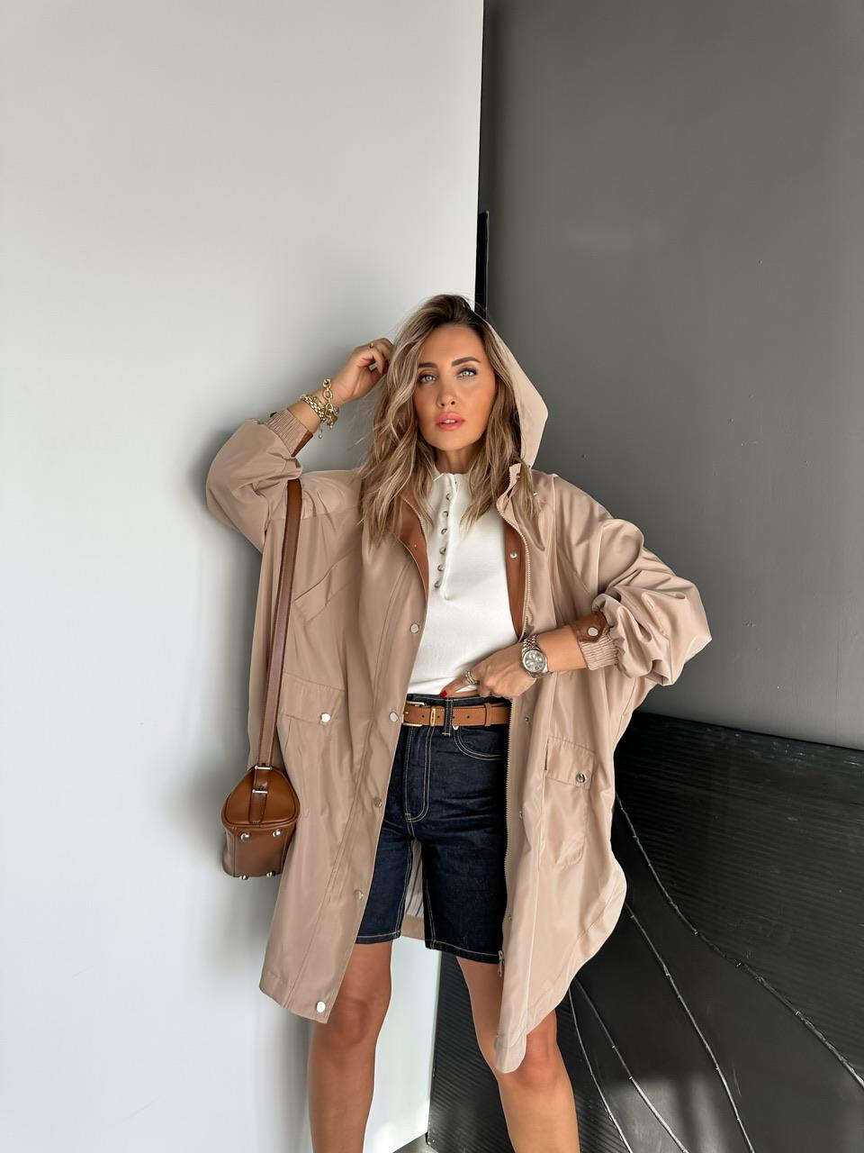 Bej Kapşonlu Tasarım Premium Trençkot
