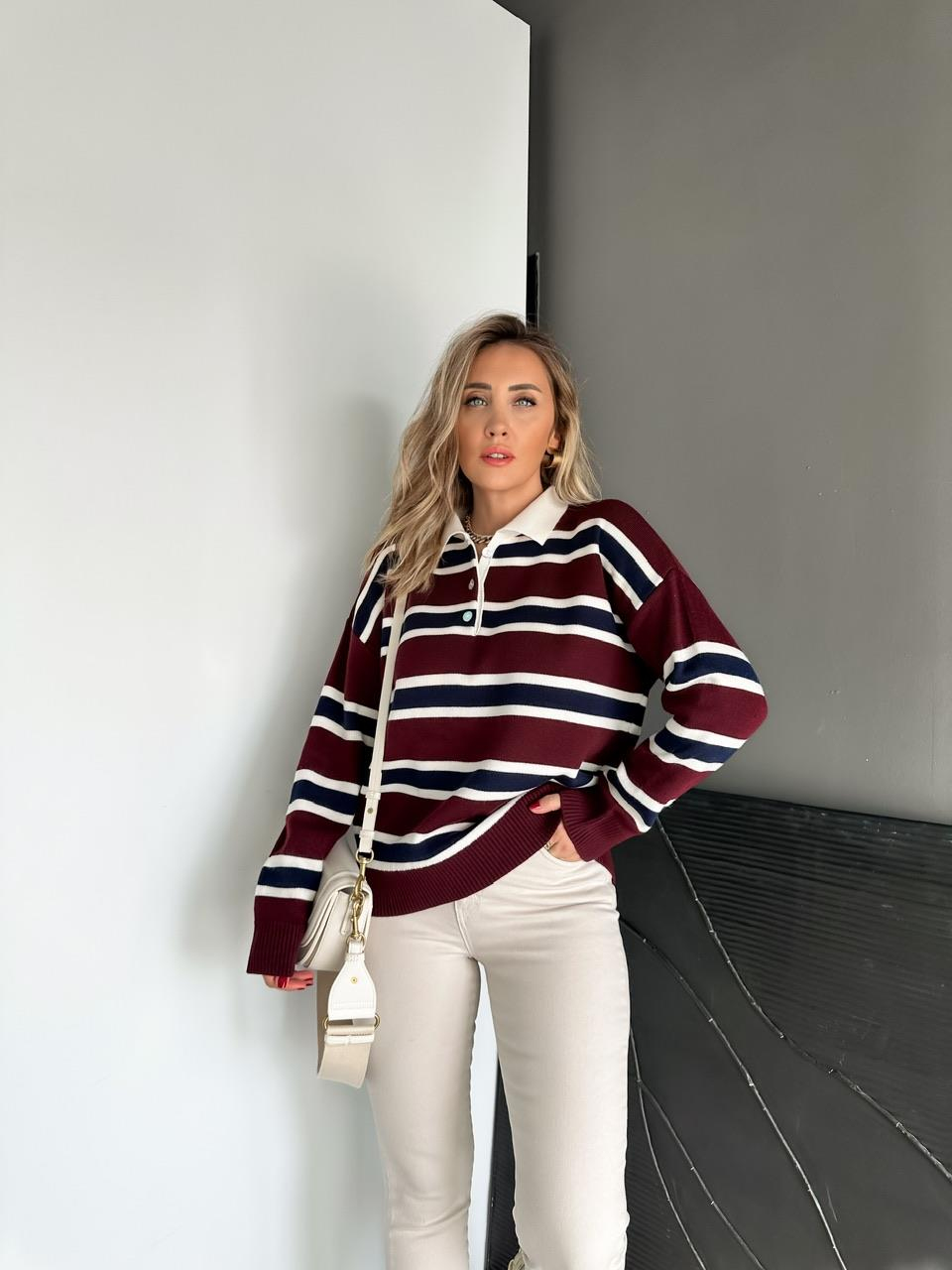 Bordo Lacivert Çizgili Polo Yaka Kazak