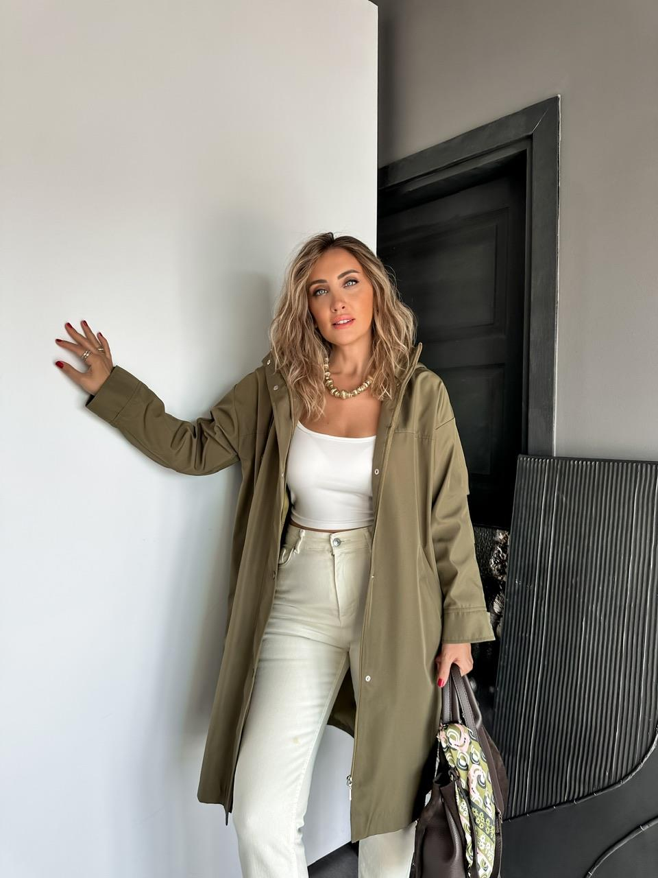 Haki Kapşonlu Çıtçıtlı Midi Boy Trençkot