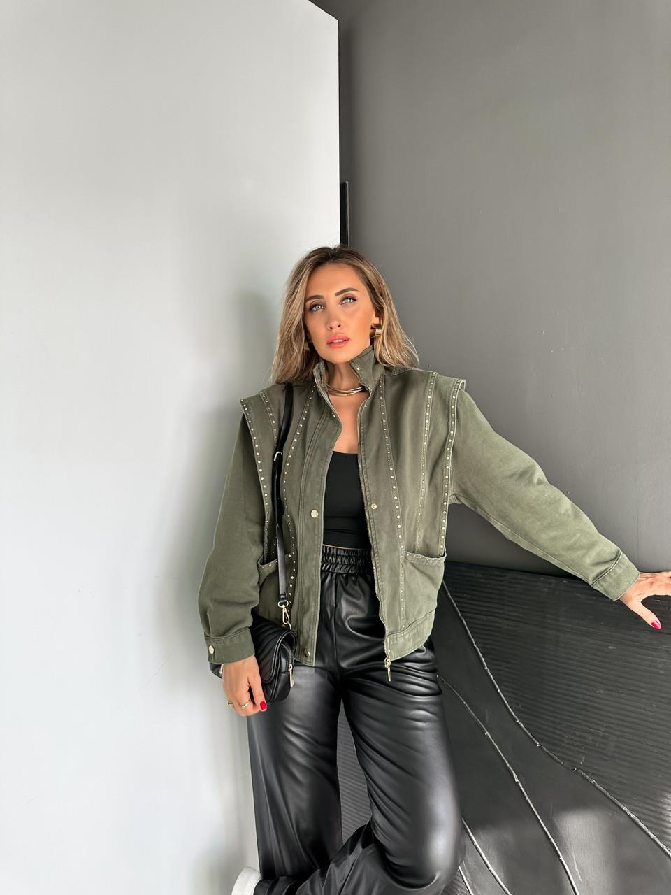 Haki Zımbalı Omuz Detaylı Tasarım Ceket