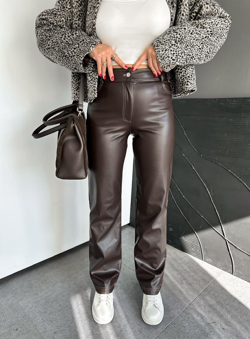 Kahve Cepli Dikişli Premium Deri Pantolon