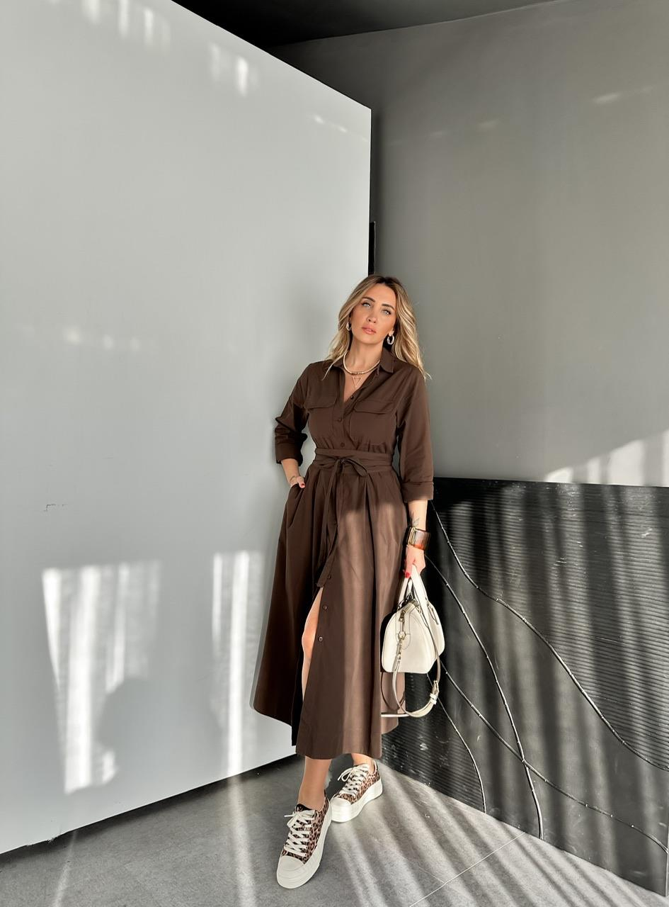 Kahve Kuşaklı Gömlek Elbise