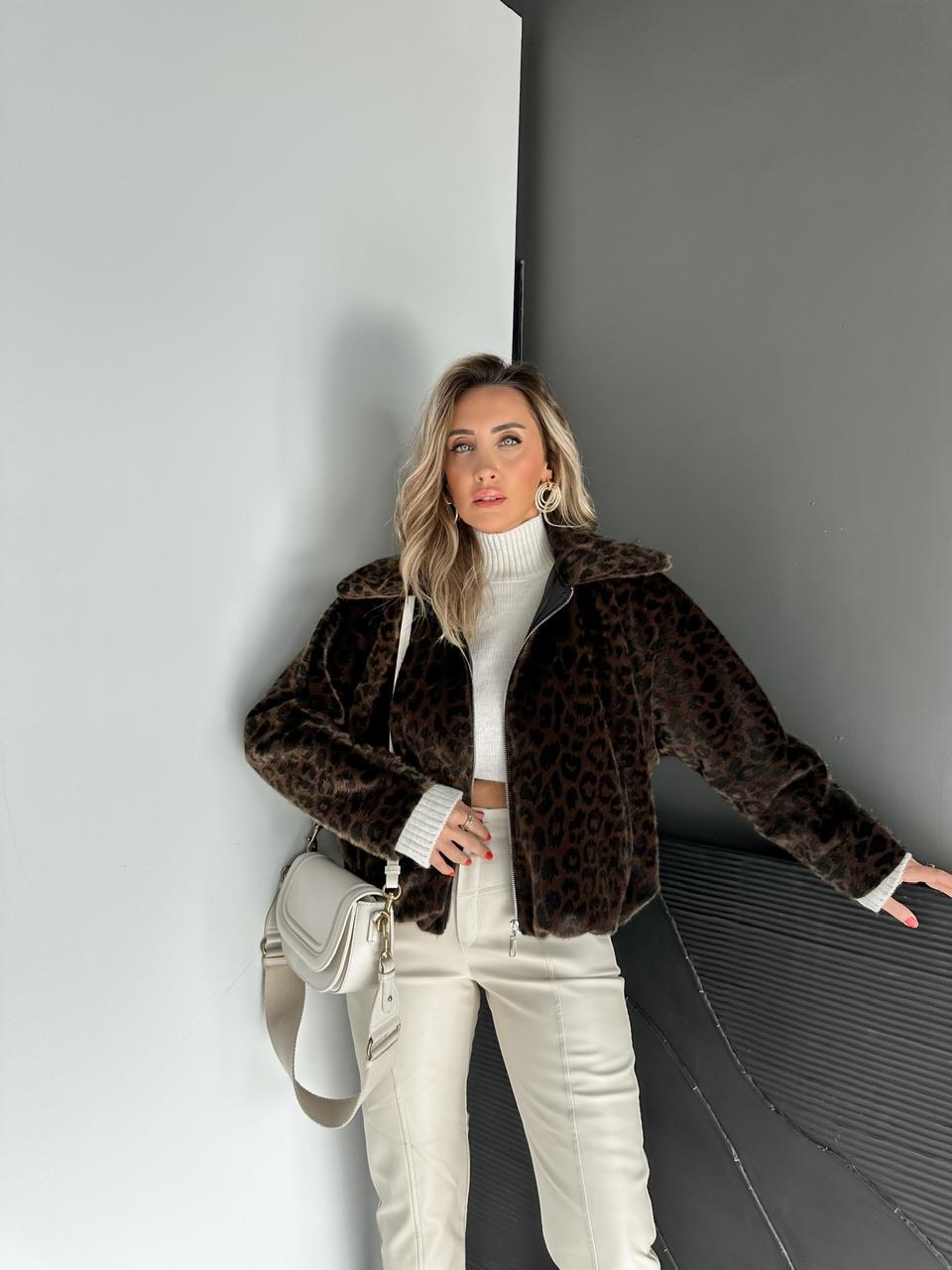 Kahve Leoparlı Deve Tüyü Bomber Mont