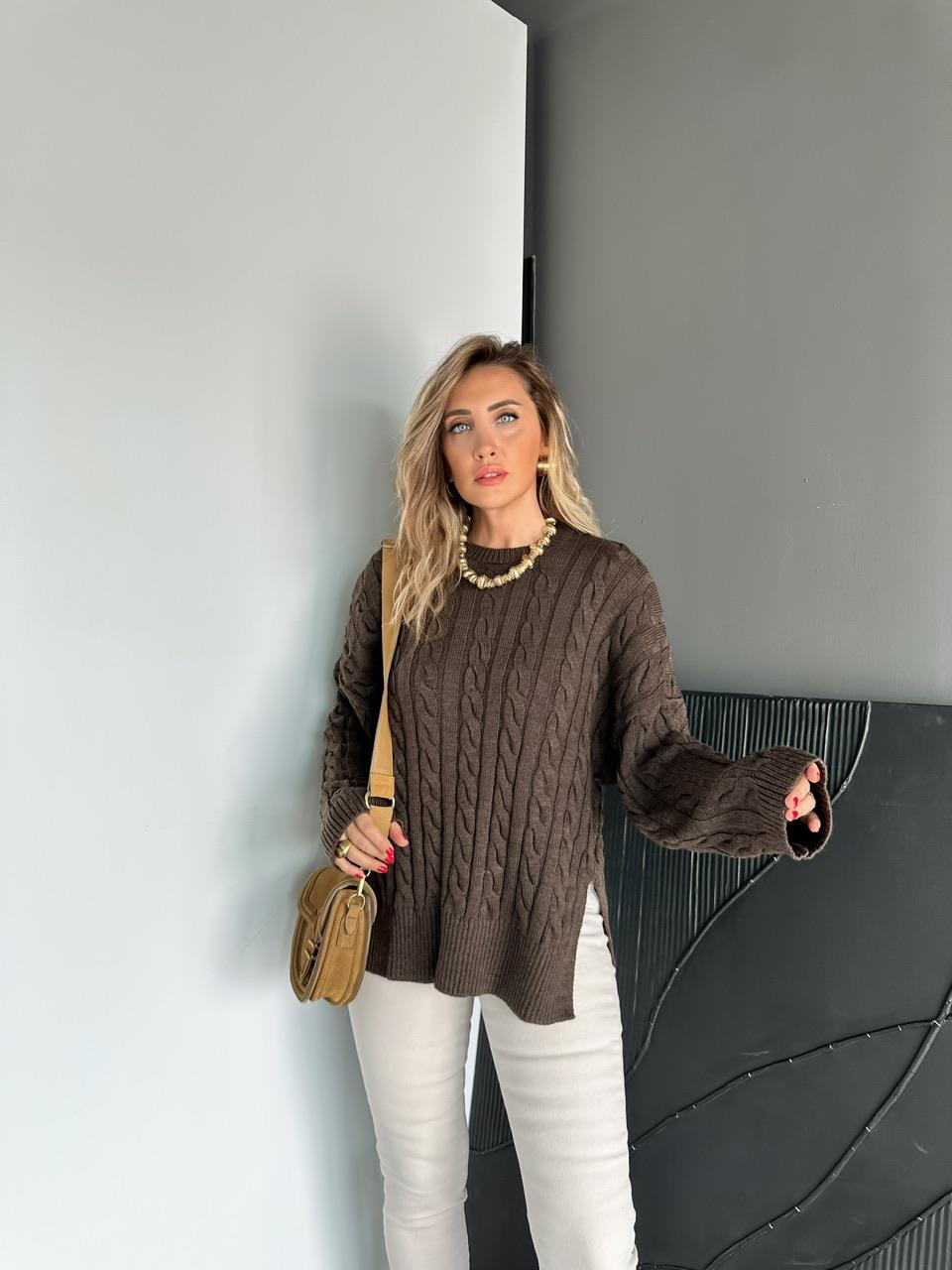 Kahve Saç Örgülü Yırtmaçlı Salaş Kazak