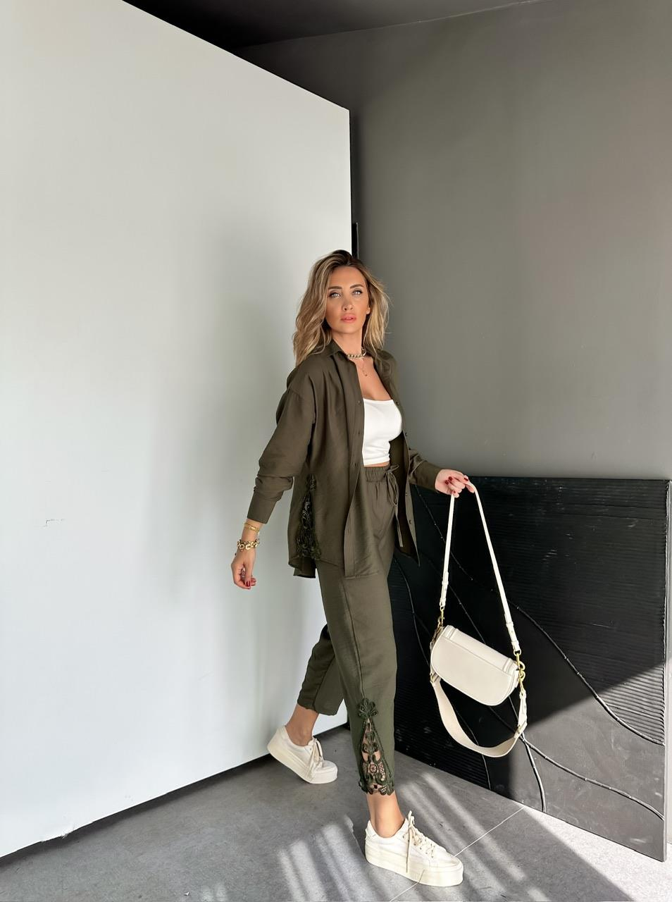 Koyu Yeşil Dantelli Gömlek Pantolon Takım
