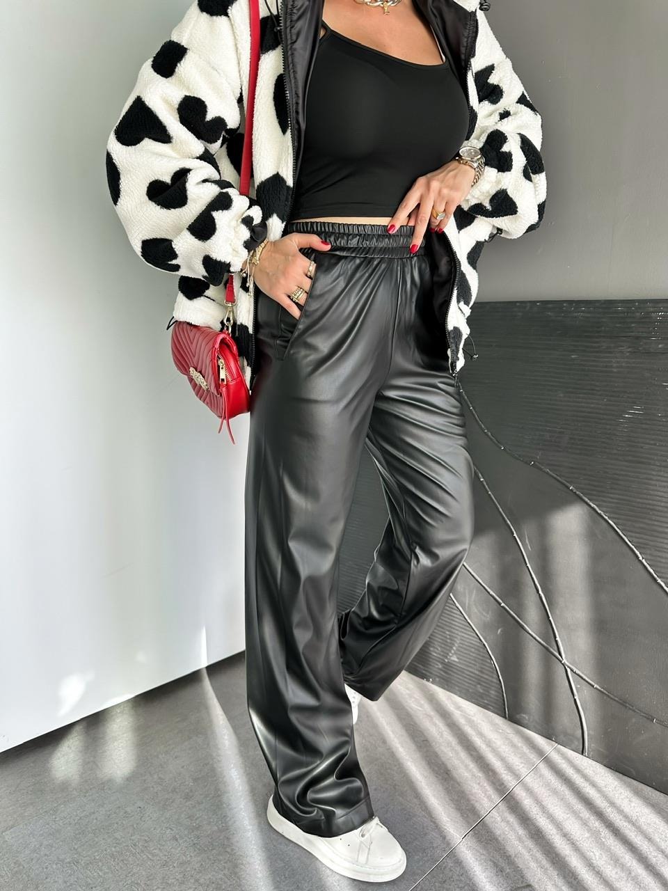Siyah Beli Lastikli Bol Kesim Deri Pantolon