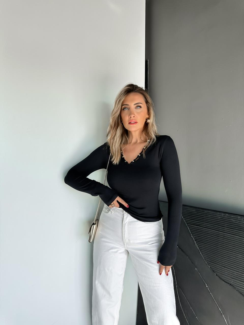 Siyah Gold Aksesuarlı V Yaka Tshirt