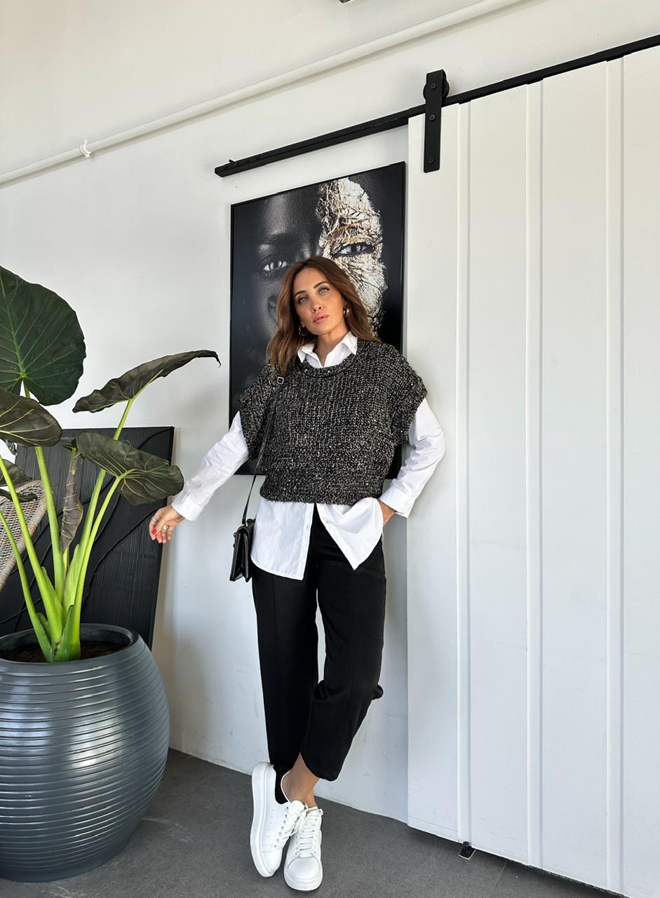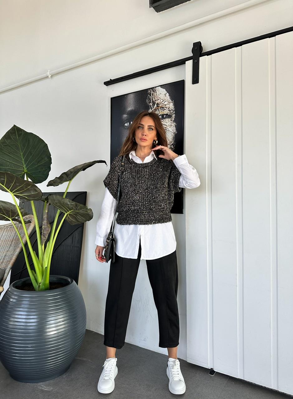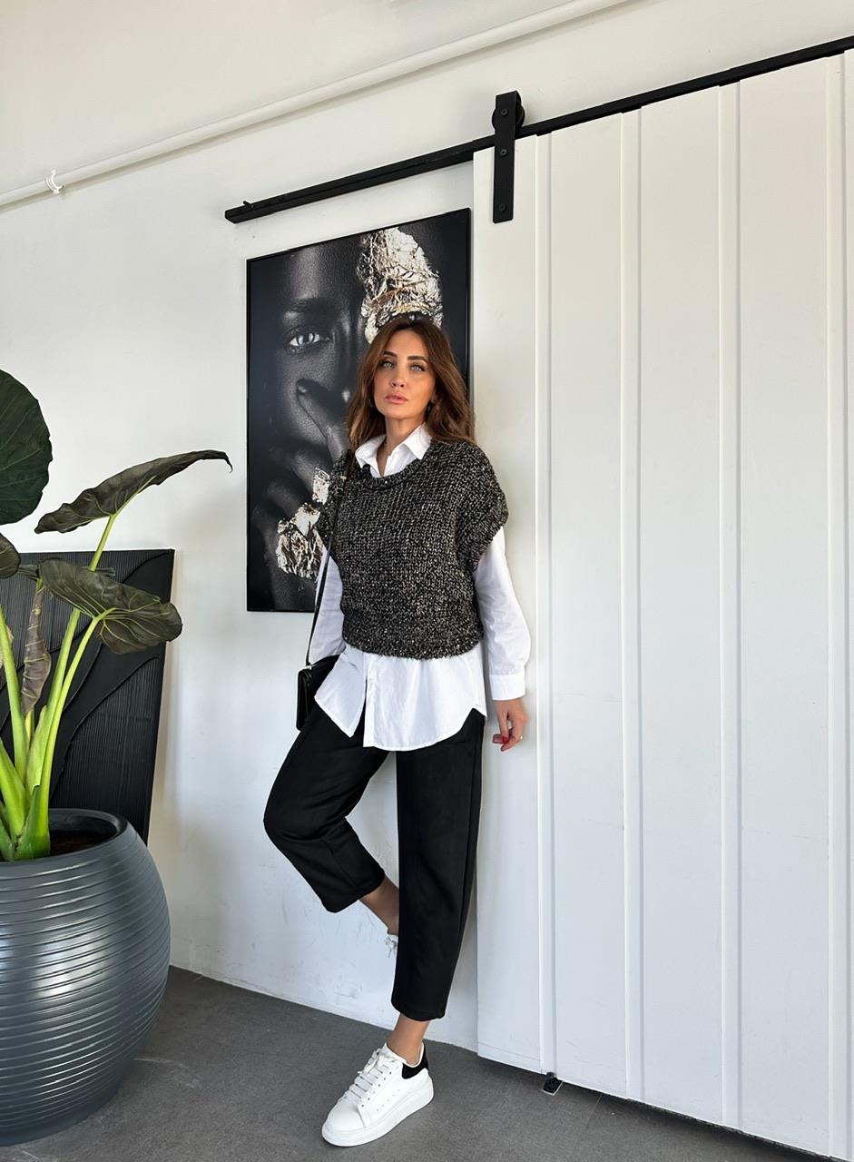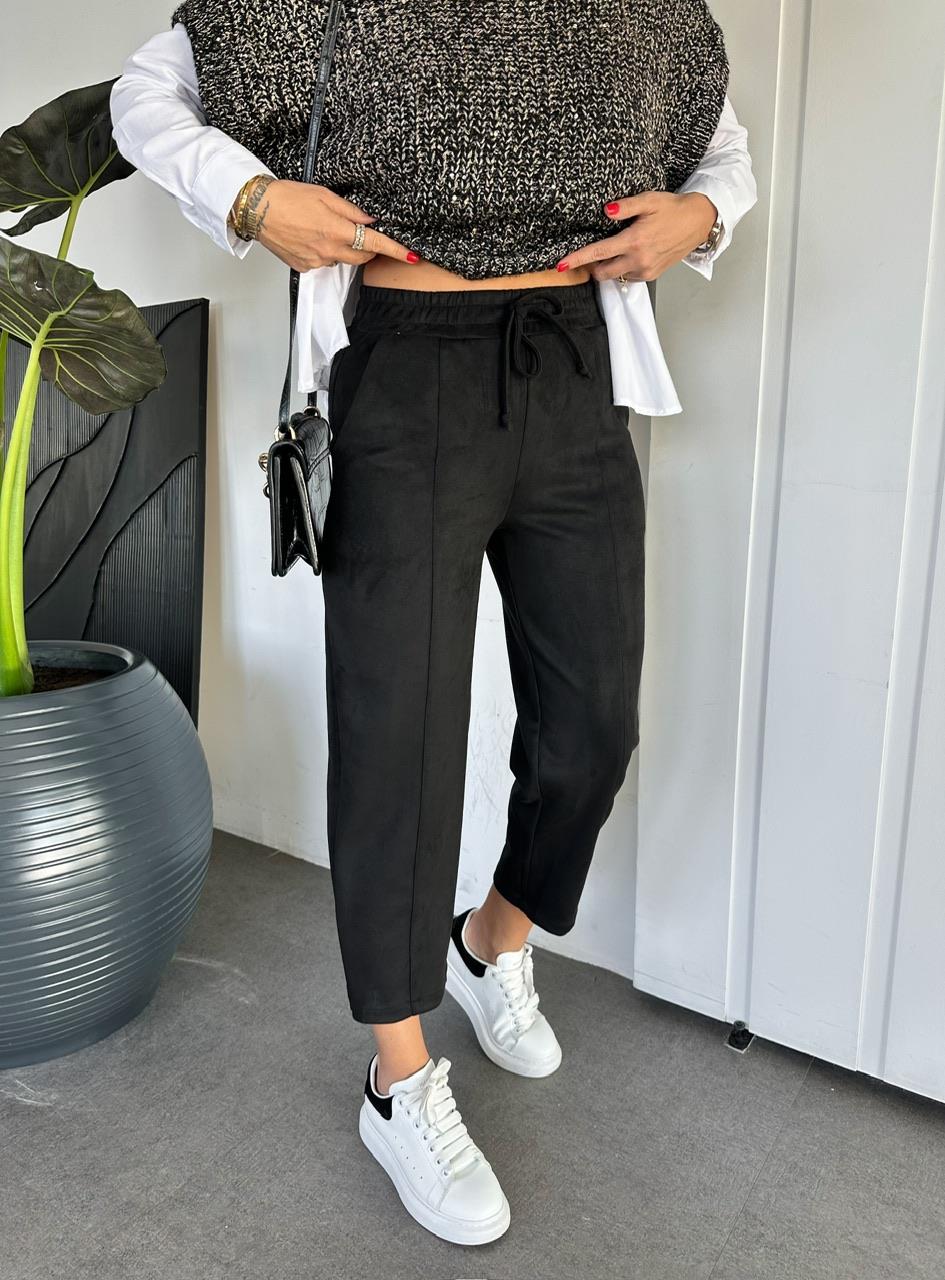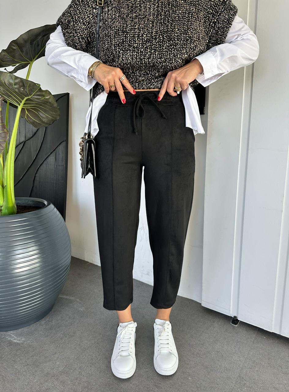 Siyah Süet Beli Lastikli Dikişli Pantolon